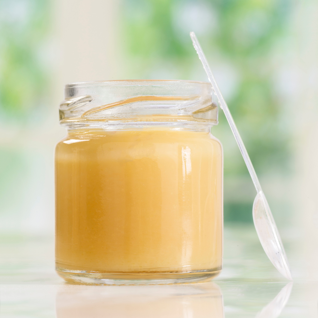 La gelée royale se présente à l'état naturel avec une texture gélatineuse et une couleur blanc-jaunâtre opaque. Elle est légèrement acide. En raison de sa composition très complète, la gelée royale contient tous les éléments nutritifs essentiels à la croissance des larves et au bien-être de la reine.